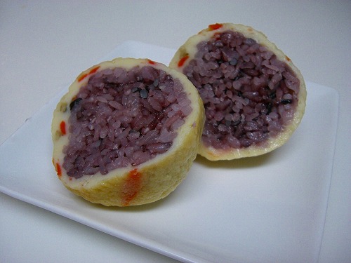 コロッケってよりは、かまぼこかな。 中はこんな感じ。黒米なんだって。